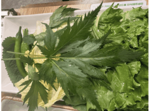 ハンバーグと、見た目が衝撃的な葉っぱに巻いて食べた事で忘れられない味になりました。